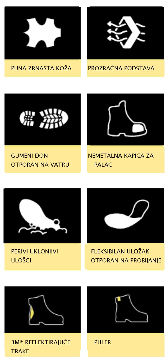 Antistatički i otporan na vatru. Izrađen od nitrilne gume s poliuretanskim slojem. Dizajniran u dvije boje radi bolje vidljivosti. Protuklizni (kopački profil) i otporan na loživo ulje.