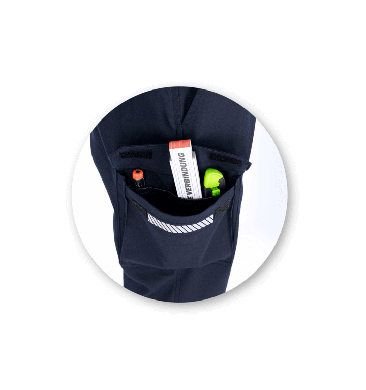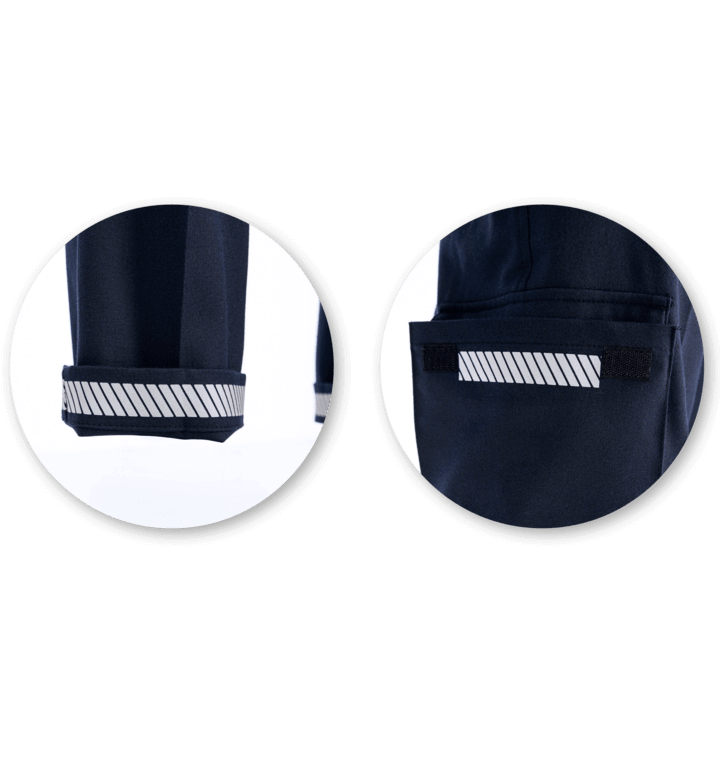 Vidljivost i sigurnost: Inovativne segmentirane reflektirajuće pruge smještene na džepovima s mijehom i na unutarnjoj strani ruba nogavica (funkcija okretanja za bolju uočljivost po potrebi).